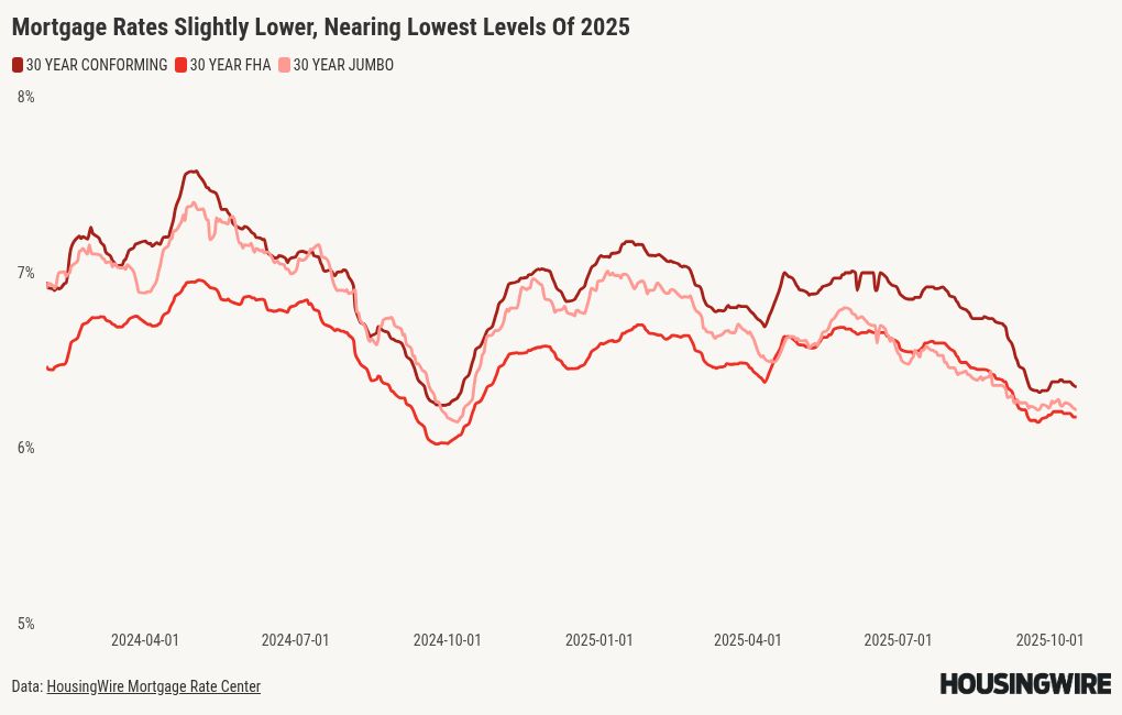 On Tuesday, HousingWire’s Mortgage Rates Center, which tracks locked loans, showed that 30-year conforming loan locks averaged 6.35% — three basis points (bps) lower than a week ago and closer to the 6.32% lowest level of 2025. Jumbo 30-year rates fell 4 bps compared to the prior week to 6.22%, while FHA 30-year loans were down from 6.2% to 6.18%.