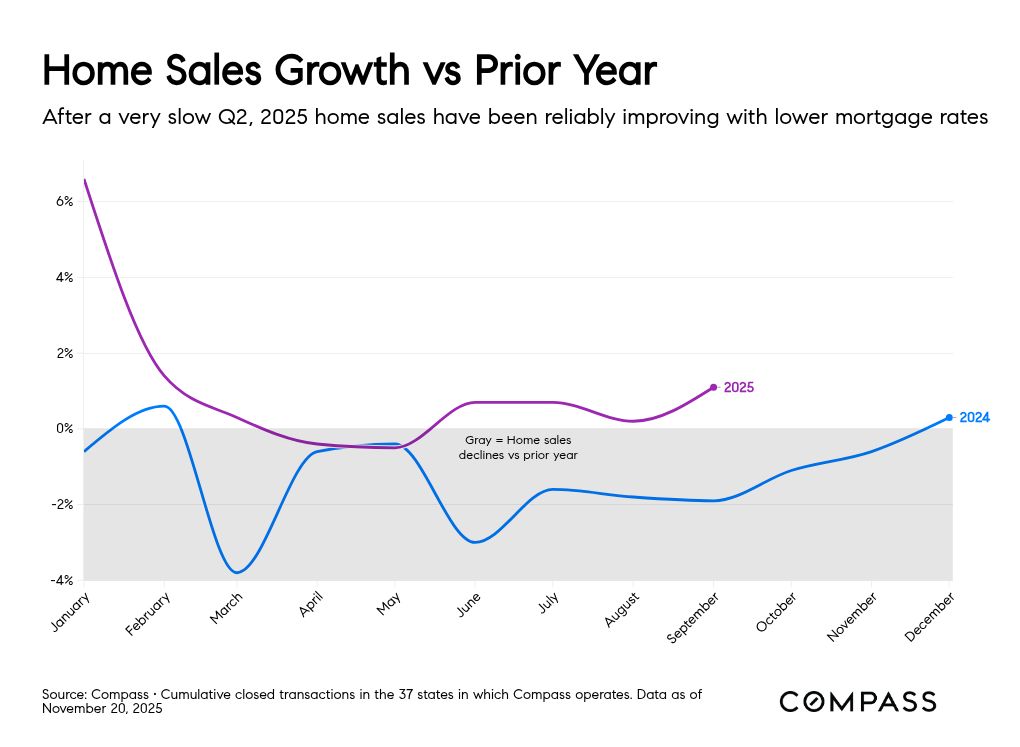 After weak second-quarter home sales when rates hovered near 7%, full year 2025 sales have recovered: in our Compass data, we count cumulative closed transactions greater than 1% above 2024 through the third quarter, the latest period for which the Company has released sales data. The Altos weekly pending data is also 1% greater than last year, through mid-November.