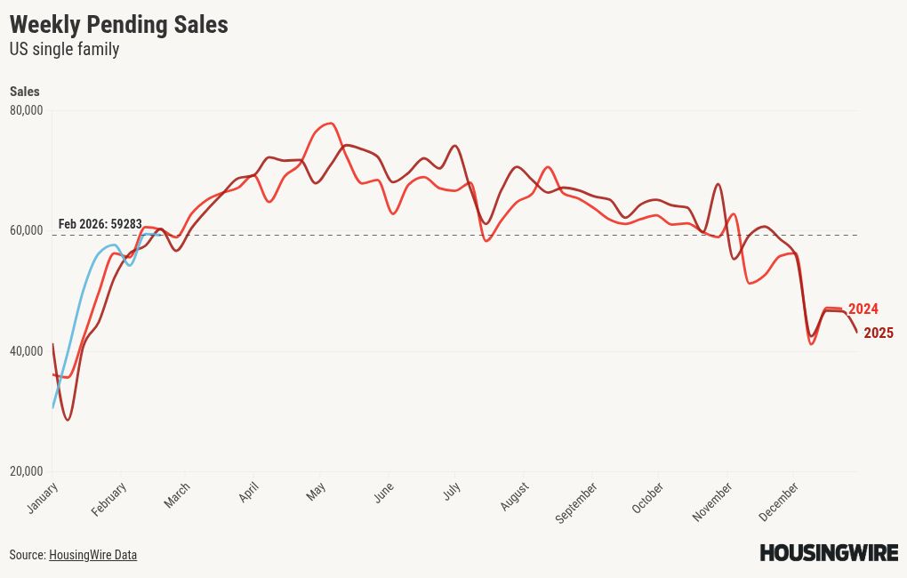 Pending home sales data provides a week-to-week perspective, though results can be affected by holidays and short-term fluctuations, such as the giant winter storm in January. We were showing year-over-year growth to start the year and that snowstorm did slow things down.